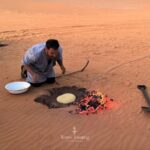 On a aussi eu la chance incroyable de participer à la Sebiba, une fête traditionnelle impressionnante, pleine d’émotions, de chants et de danse. Mais aussi la préparation du pain de sable, cuit sous les braises, que nous avons ensuite partagé ensemble dans le désert. Une vraie immersion !