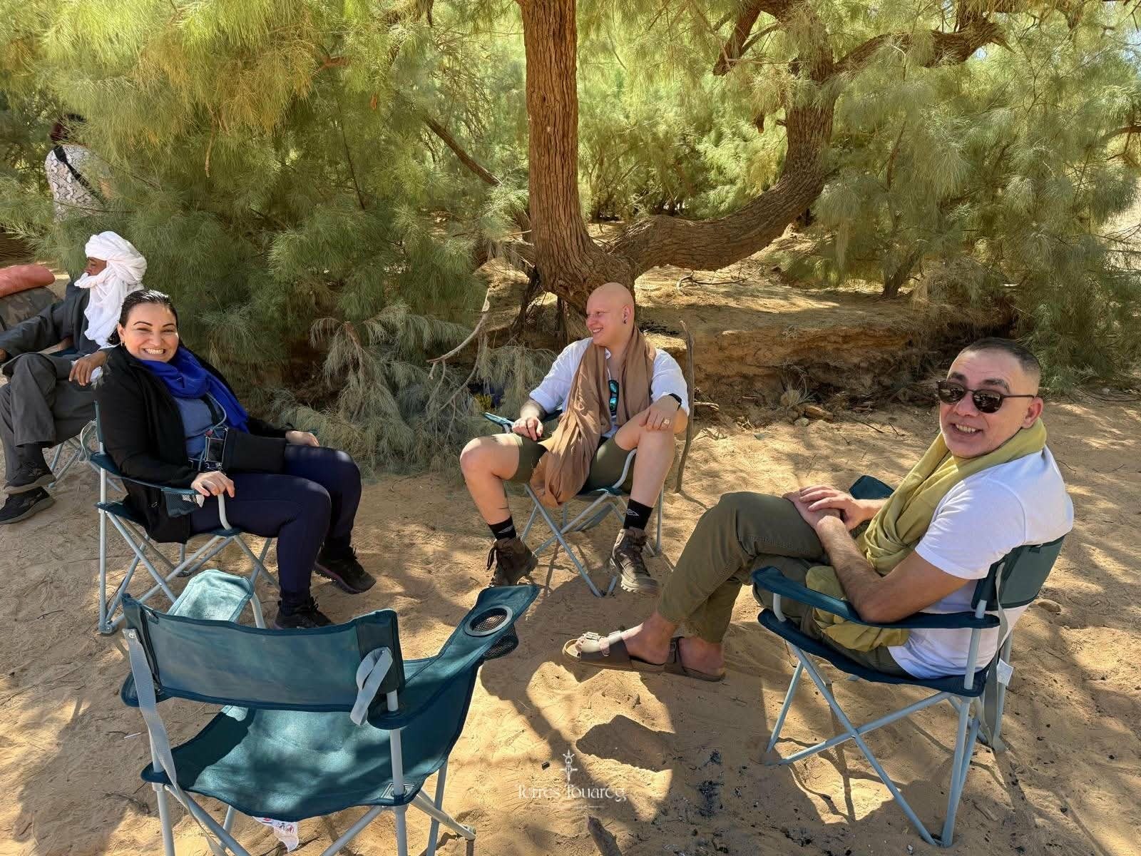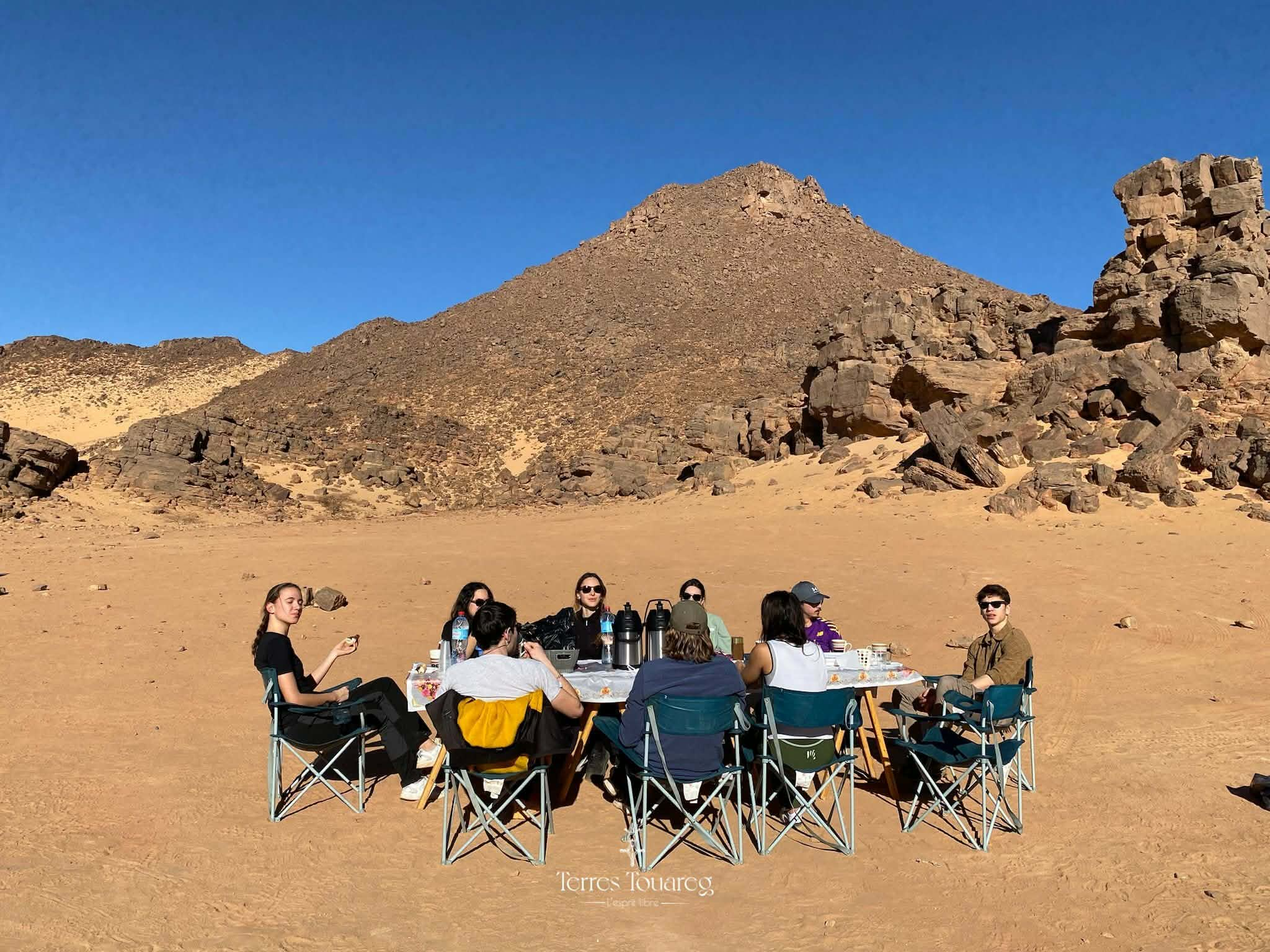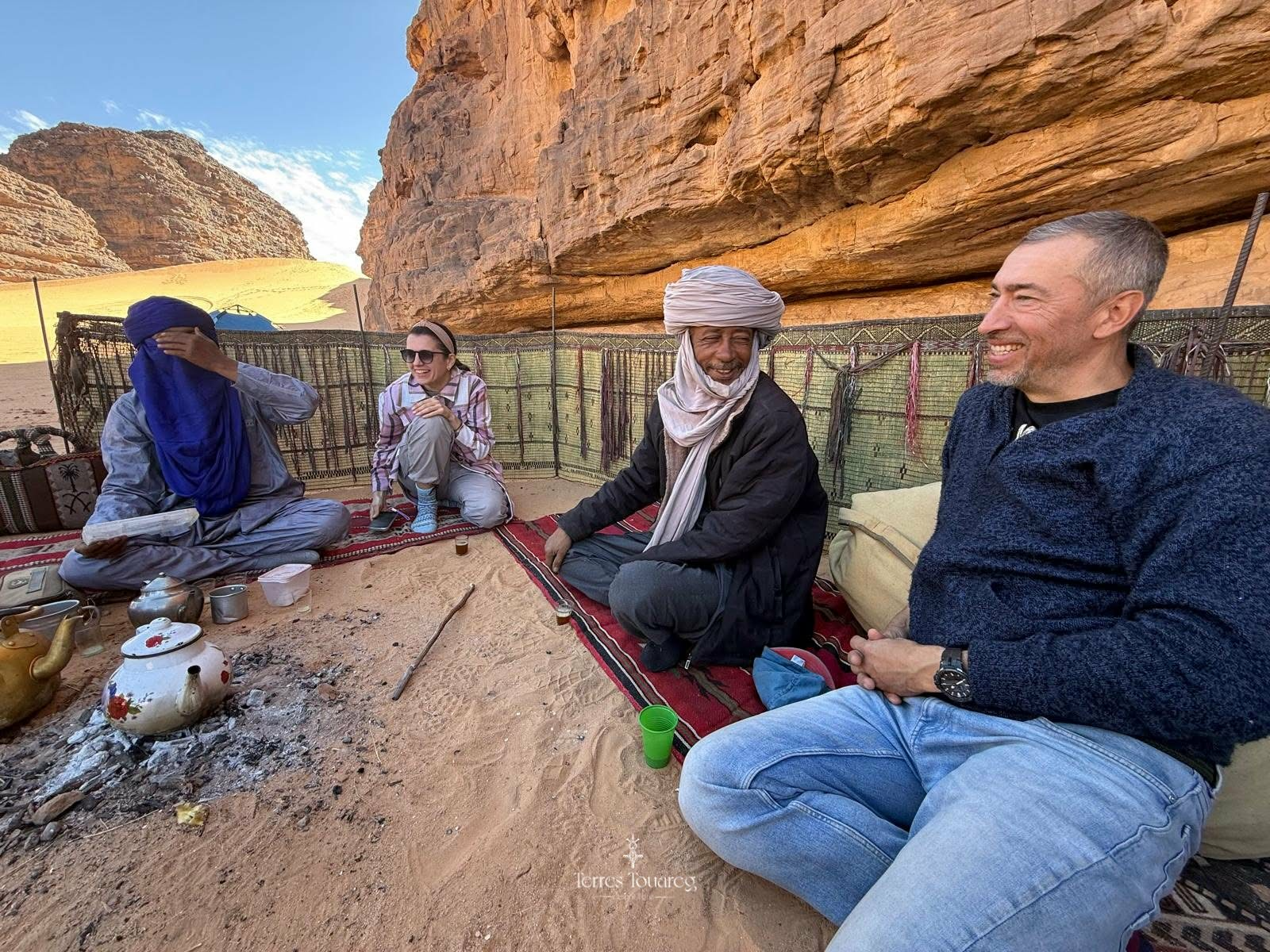 Chaque moment passé dans le désert a été magique : les paysages grandioses, les nuits étoilées, les repas traditionnels cuisinés sur le feu, et surtout les échanges humains riches et sincères avec nos guides touaregs. Leur connaissance du désert, leur sens de l’hospitalité et leur respect de la nature nous ont profondément touchés.