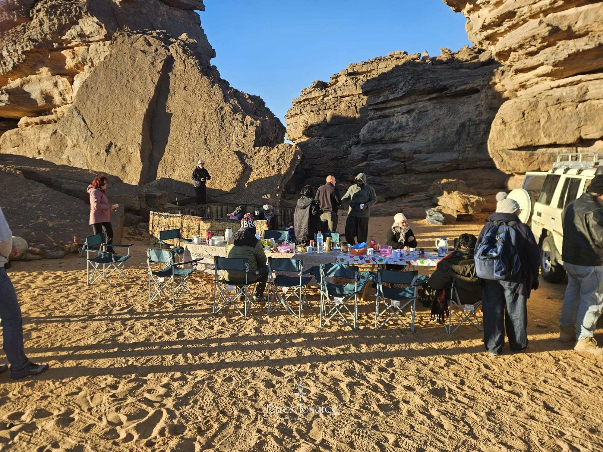 J’ai découvert des paysages magnifiques, dormi sous les étoiles, goûté à la vraie vie dans le désert, et partagé des moments forts avec les guides et les autres voyageurs. Chaque jour était une surprise : randonnées, canyons, peintures rupestres, dunes, et bien sûr, beaucoup de thé autour du feu accompagné des chants des musiciens touaregs.