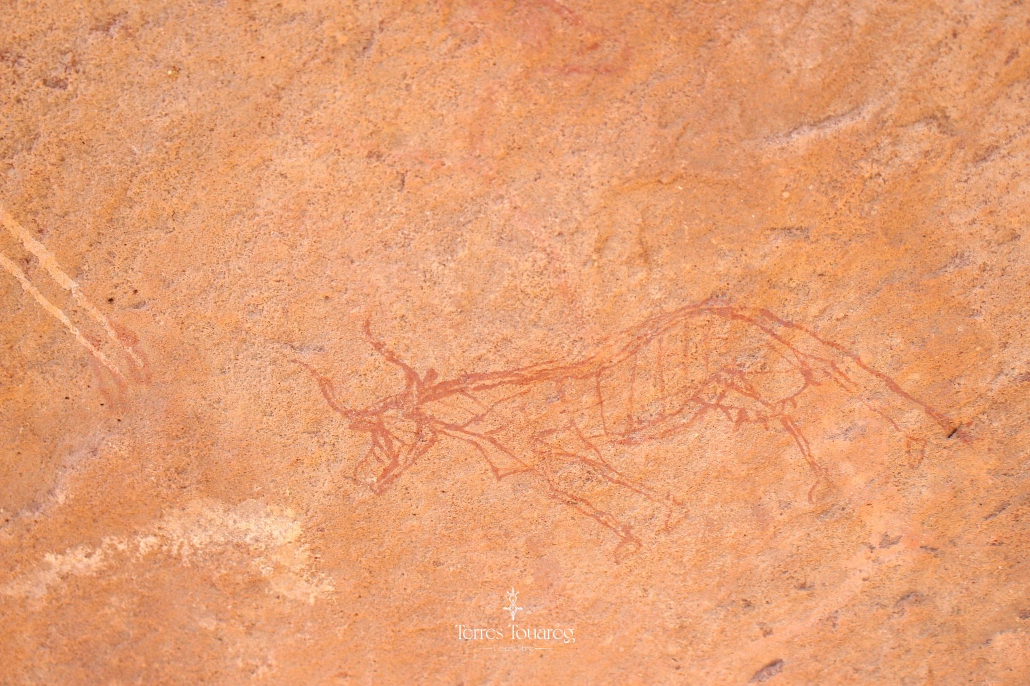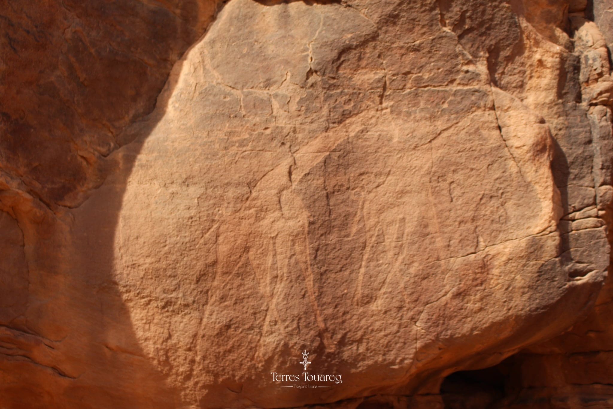 gravure rupestre girafe et homme avec lance - Circuit tadrart Rouge sahara algérie