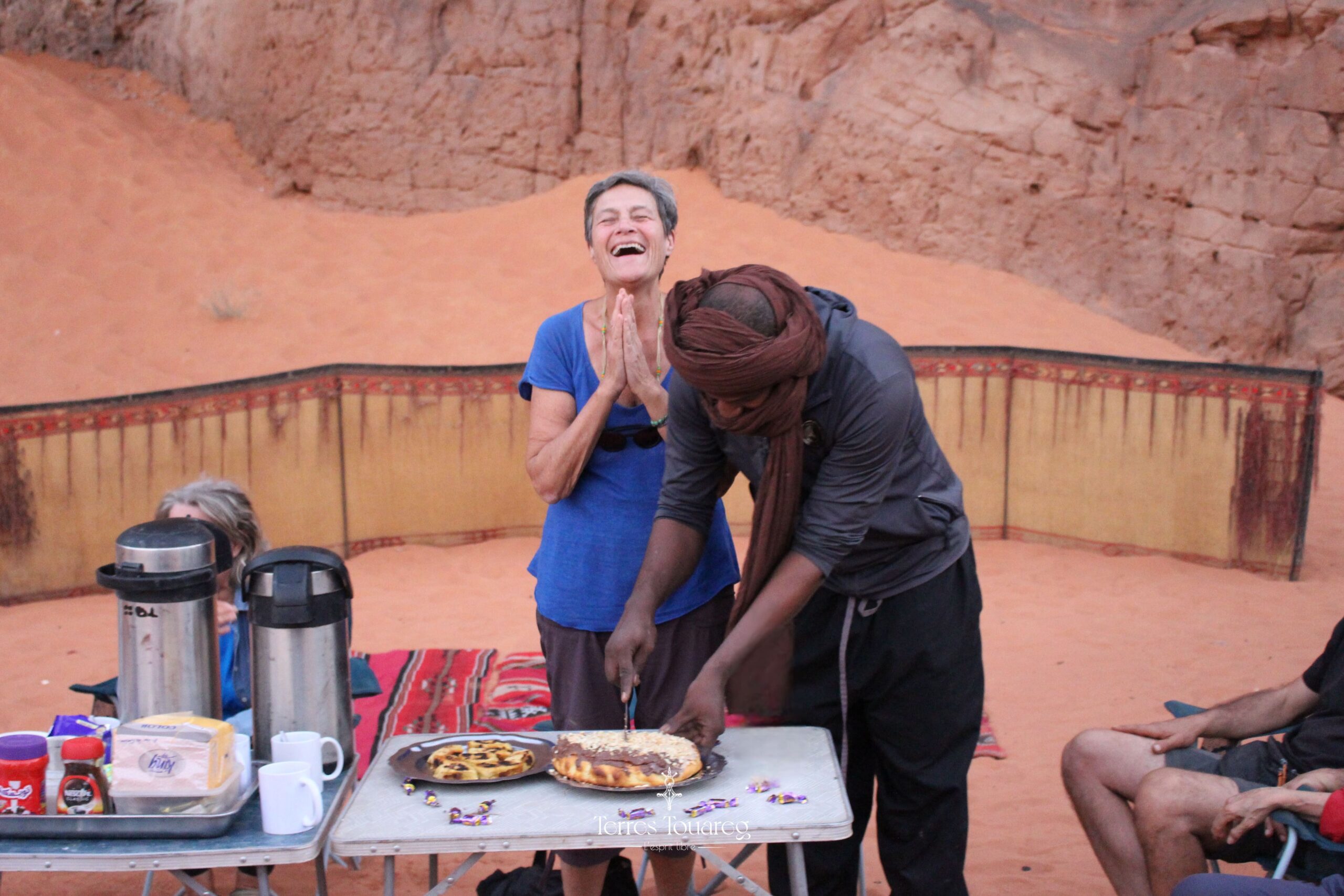 Une merveilleuse expérience, coupée du monde, des paysages extraordinaires à en avoir les larmes aux yeux. Les mots me manquent pour décrire cette semaine tellement riche. Les touaregs qui nous ont accompagnées ont été formidables et nous ont fait sentir en sécurité à chaque instant, Jamal le cuisinier nous a concocté d’excellents petits plats. Que du bonheur, une parenthèse hors du temps, magique…